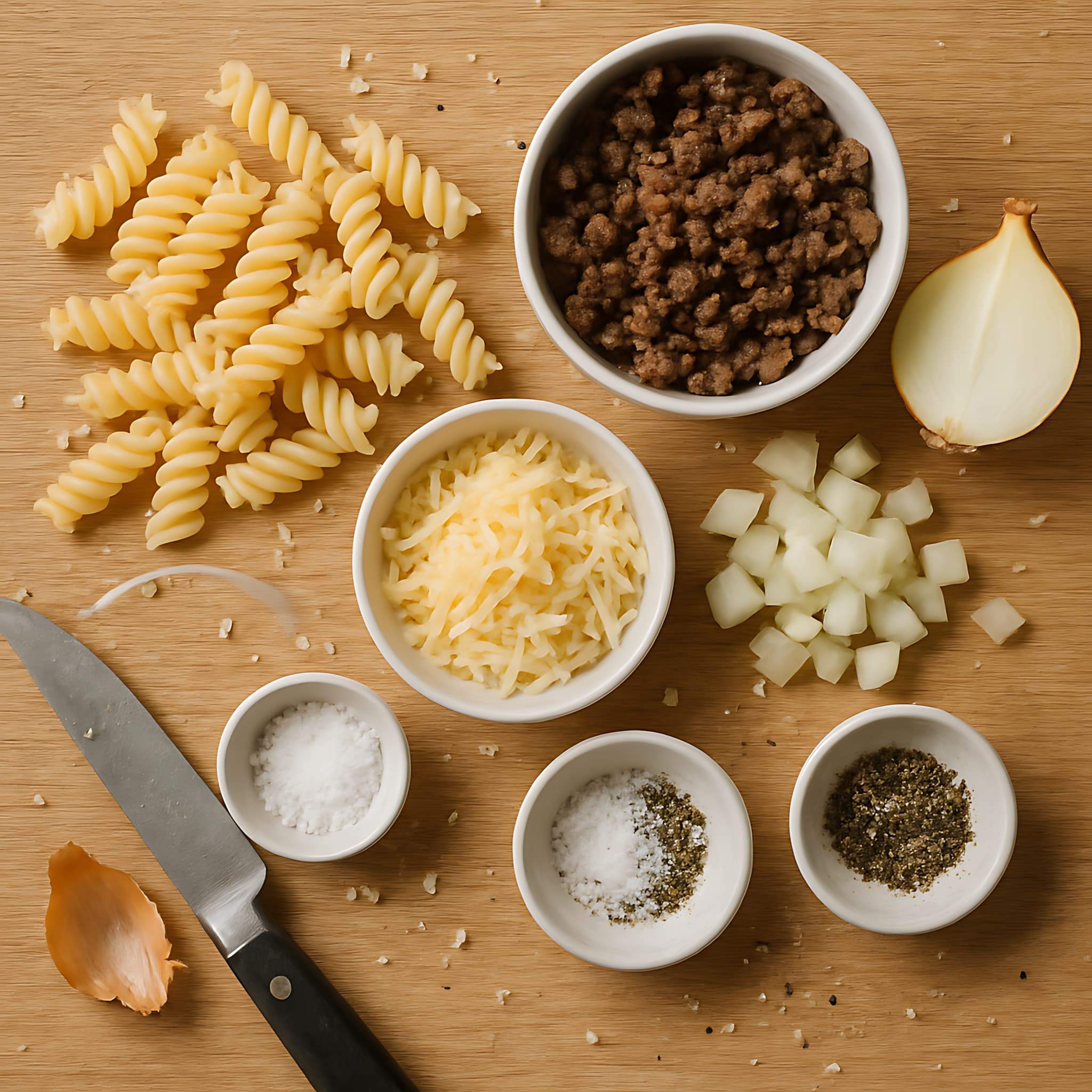 - Vermengen: Die gekochten Nudeln unter das Hackfleisch mischen und alles gleichmäßig in eine Auflaufform geben.